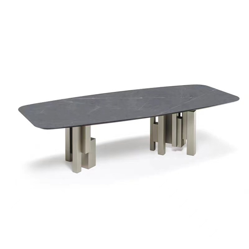 A peça central desta mesa de jantar é o seu impressionante revestimento de cerâmica de mármore.com requintados padrões de veias que acrescentam um toque de elegância e sofisticaçãoEsta cerâmica de alta qualidade oferece uma durabilidade excepcional, sendo resistente a arranhões, manchas e calor.sabendo que a sua mesa manterá a sua condição original durante anos.